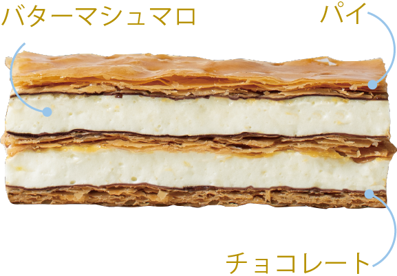 160層にも折重ね焼きあげた、バター100%のパイをチョコレートでコーティングし、バターマシュマロと重ね合わせました。今までありそうでなかったパイとマシュマロの組み合わせに加え、バターによるマシュマロの濃厚なくちどけを是非お楽しみください。