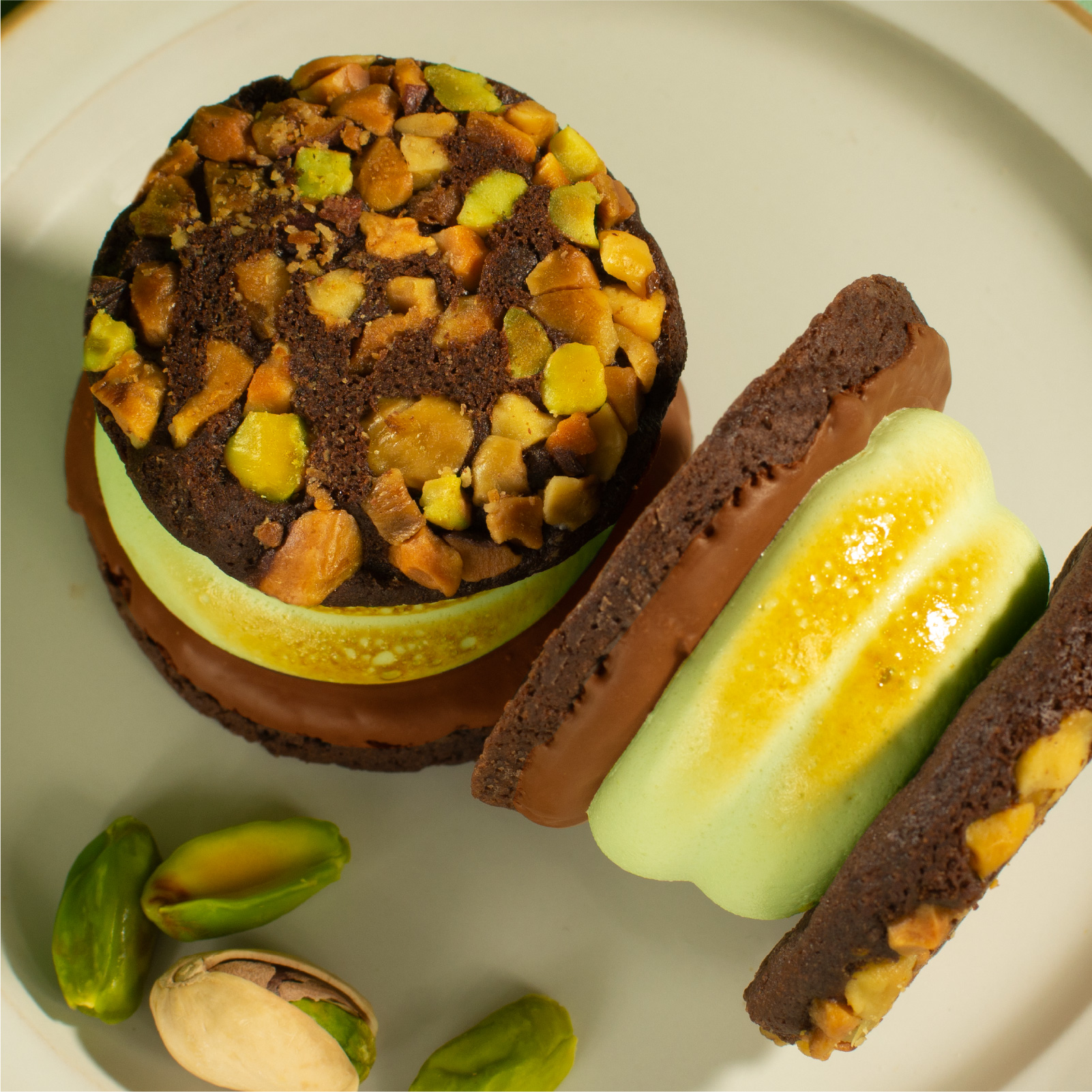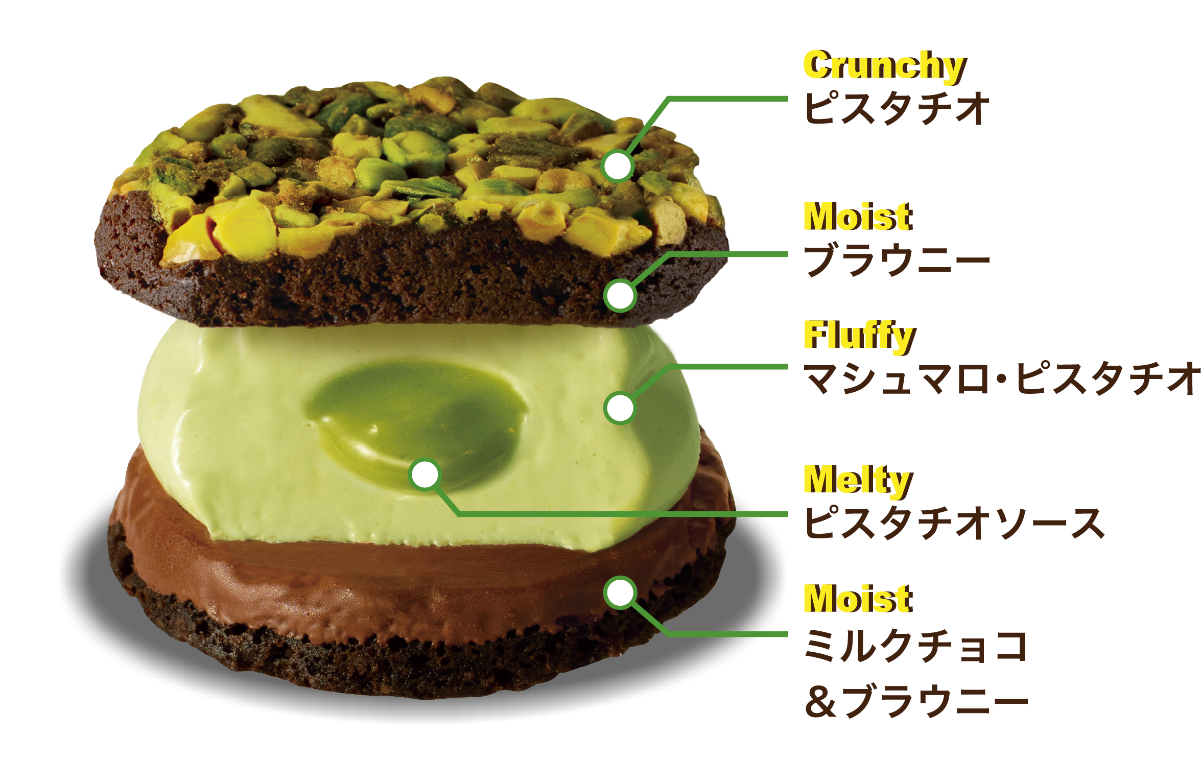 上部のチョコレートブラウニーには表面にぎっしりとピスタチオを敷き詰め、じっくりと焼き上げたこだわりのピスタチオチョコブラウニー。表面のピスタチオが絶妙にローストされ、ピスタチオの香ばしさや旨味をしっかりとお楽しみいただけます。下部のチョコレートブラウニーはミルクチョコレートでコーティングすることで、マシュマロとピスタチオの美味しさを優しく引き立てます。上下のブラウニーで挟むのは【ベイクドマロウ】自慢のふわふわの焼マシュマロ・ピスタチオ。一つ一つ丁寧に焼かれたマシュマロの中からはピスタチオソースがとろりととろけ出します。